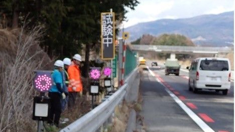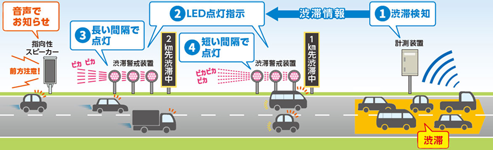 渋滞を光点滅でお知らせするシステムを運用します。光点滅を見かけたら、その先で渋滞していますので、前方に注意して運転をお願いします。