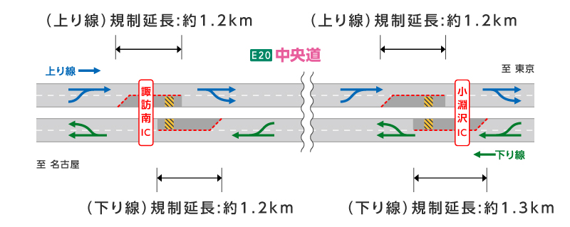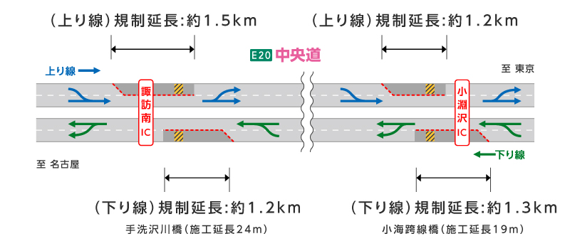 上下線で車線規制をおこなっています。(土日祝も実施) → 所要時間